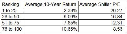 I have taken Robert Shiller’s data which is publicly available on his website and have done some calculations for the years from 1910 to 2009. For each year, I have calculated 10-year real returns and have taken the Shiller P/E ratio for each year from his file. (Although in Shiller’s data set, he uses the average daily closing price for each month so real returns will not be perfectly accurate for each year, my results will be close enough to make my point). I have ranked each year from one to 100 by Shiller P/E with one being the year with the highest Shiller P/E. Please see the table below for the results: