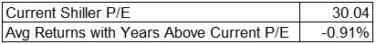 What is notable is that for each of the four categories as the Shiller P/E declines the average 10-year real return increases. According to Shiller’s website, the current Shiller P/E ratio is 30.04. I have taken the average of all years in my population with a Shiller P/E above the current Shiller P/E of 30.04. Here are my results: